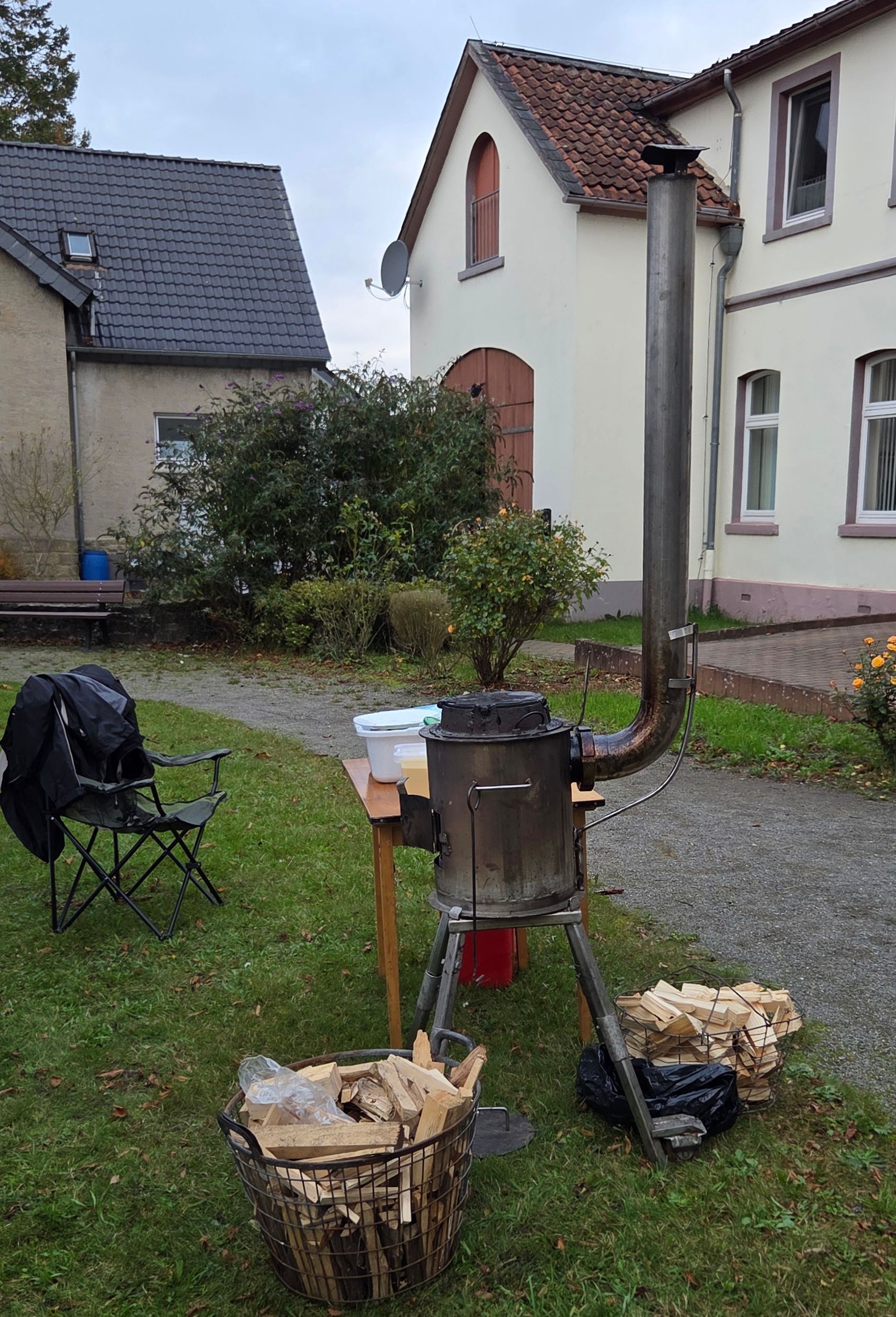 Dank der guten Vorbereitung von Familie zur Lippe und Familie Tamm trafen wir uns nicht im Garten, sondern wegen des Regens in der freigeräumten Werkstatt von Olaf Grünberg. Dort konnten wir Kuchen, Tee, Kaffee und den hervorragenden Apfelpunsch von Ernst zur Lippe im Trockenen genießen.