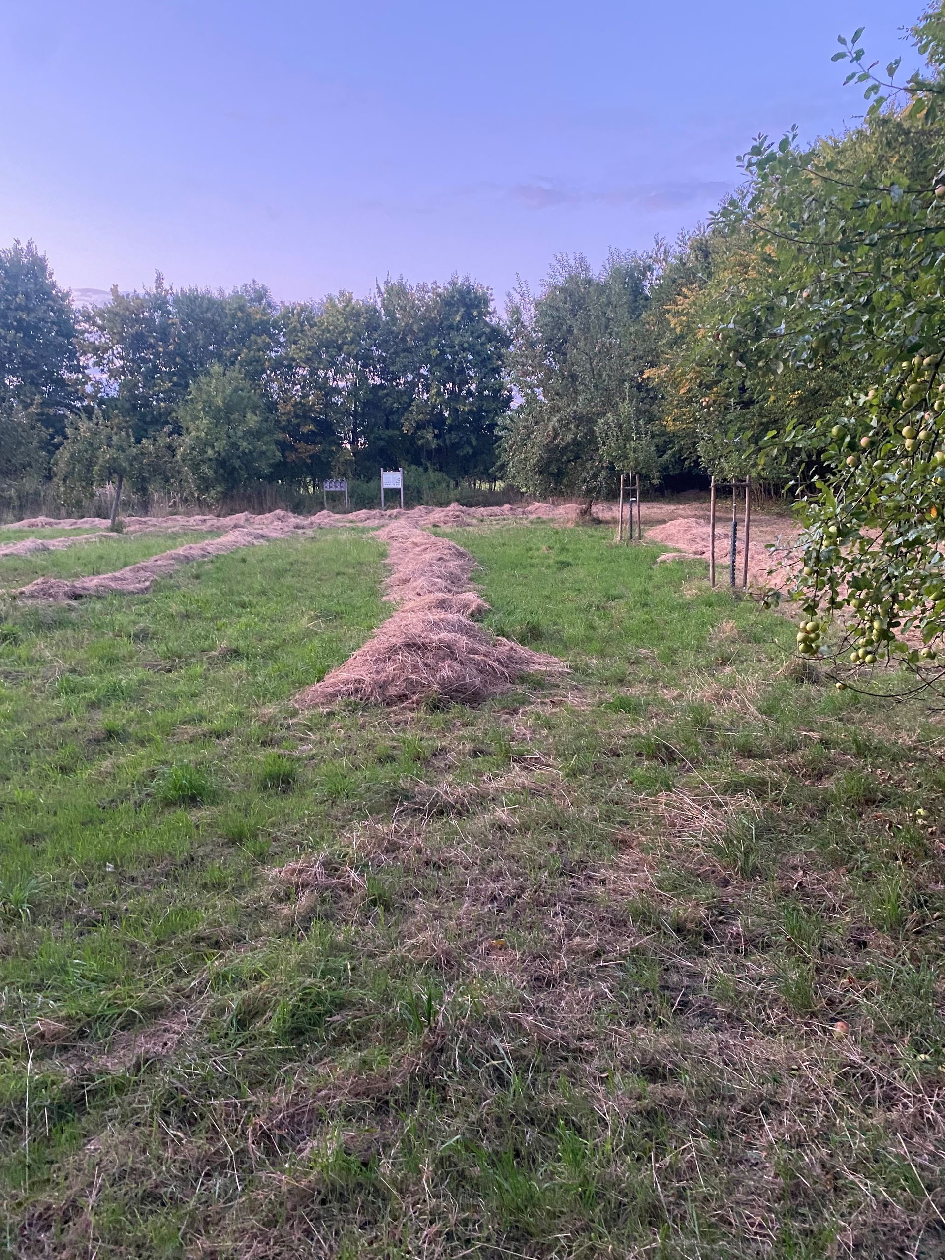 Nachdem wir mit Hilfe des Tracktoren Vereins aus Detmold die Wiese am 8. August gemäht hatten, haben Alexander und Herby nach dem Trocknen das Heu zu Reihen gelegt. Doch nun, wohin damit? Einige Telefonate später und dank der guten Kontakte von Herby haben wir nun zwei große Ballen auf der Wiese und einen Bauern, der diese Heuballen abholt.