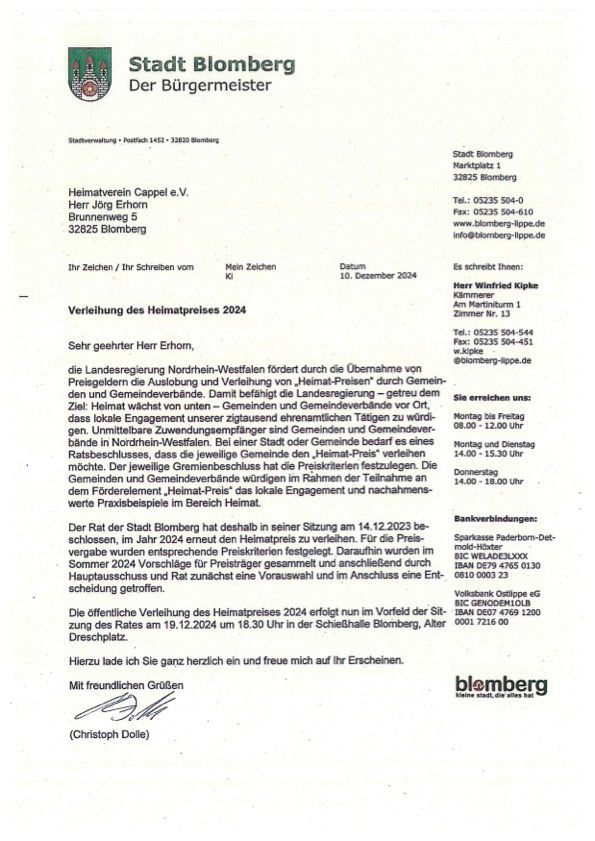 Dazu erschienen auf der Homepage der Stadt Blomberg am 30.12.24 und in der LZ am 20.12.24 folgende Artikel (aufrufbar über die Links):